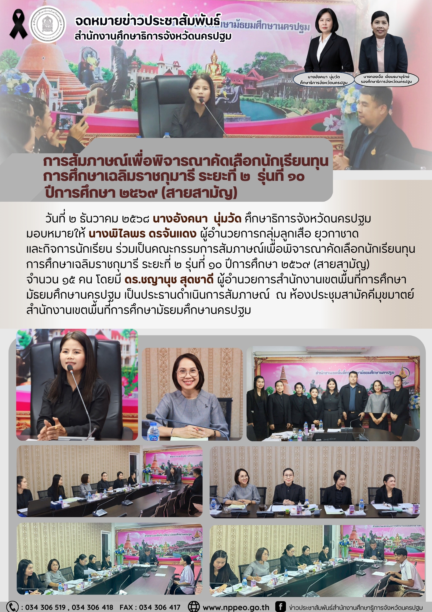 การสัมภาษณ์เพื่อพิจารณาคัดเลือกนักเรียนทุนการศึกษาเฉลิมราชกุมารี ระยะที่ ๒ รุ่นที่ ๑๐ ปีการศึกษา ๒๕๖๙ (สายสามัญ)