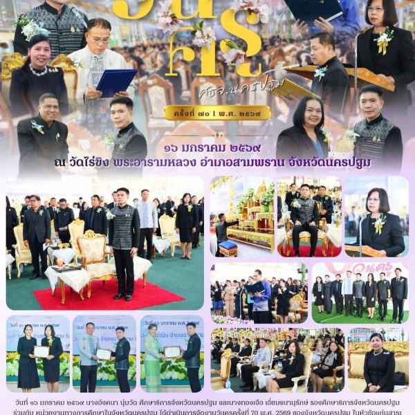 วันที่ 16 มกราคม 2569 นางอังคนา นุ่มวัด ศึกษาการจังหวัดนครปฐม และนางทองเจือ เอี่ยมธนานุรักษ์ รองศึกษาธิการจังหวัดนครปฐม ร่วมกับหน่วยงานทางการศึกษาในจังหวัดนครปฐม ได้ดำเนินการจัดงานวันครูครั้งที่ 70 พ.ศ. 2569 ของจังหวัดนครปฐม ในหัวข้อแก่นสาระ (Theme) คือ “พระผู้ทรงเป็นแม่และครูแห่งแผ่นดิน” โดยมีวัตถุประสงค์เพื่อเทิดพระเกียรติ สมเด็จพระนางเจ้าสิริกิติ์ พระบรมราชินีนาถ พระบรมราชชนนีพันปีหลวง เพื่อประกอบพิธีระลึกถึง พระคุณบูรพาจารย์ ส่งเสริมสามัคคีธรรมระหว่างครูและความเข้าใจอันดีระหว่างครูกับประชาชน ส่งเสริมยกย่องชูเกียรติ ผู้ประกอบวิชาชีพทางการศึกษาที่ประกอบคุณงามความดีหรือทำคุณประโยชน์ต่อวงการศึกษา ให้เป็นที่ประจักษ์แก่สาธารณชน ณ อาคารอเนกประสงค์ วัดไร่ขิงพระอารามหลวง อำเภอสามพราน จังหวัดนครปฐม โดยมี นายยงยุทธ สวนทอง รองผู้ว่าราชการจังหวัดนครปฐม ให้เกียรติเป็นประธานในพิธีดังกล่าว