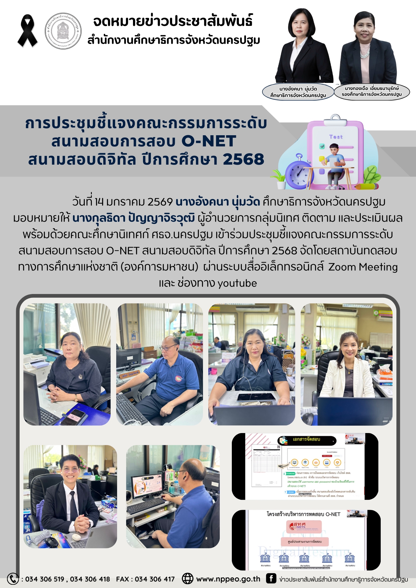 มอบหมายให้ นางกุลธิดา ปัญญาจิรวุฒิ ผู้อำนวยการกลุ่มนิเทศ ติดตาม และประเมินผล พร้อมด้วยคณะศึกษานิเทศก์ ศธจ.นครปฐม เข้าร่วมประชุมชี้แจงคณะกรรมการระดับสนามสอบการสอบ O-NET สนามสอบดิจิทัล ปีการศึกษา 2568 จัดโดยสถาบันทดสอบ