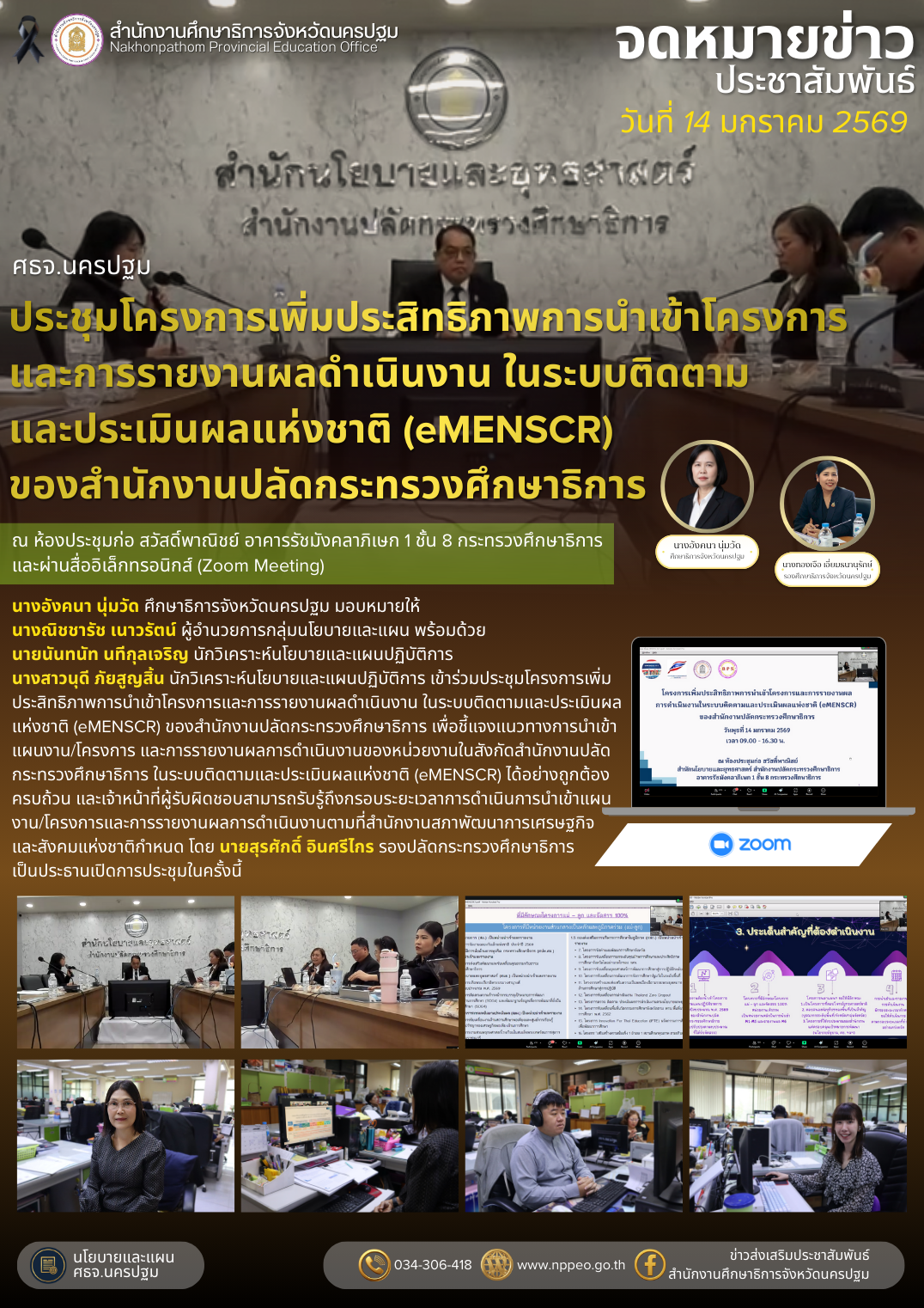 วันที่ 14 มกราคม 2569 นางอังคนา นุ่มวัด ศึกษาธิการจังหวัดนครปฐม มอบหมายให้ นางณิชชารัช เนาวรัตน์ ผู้อำนวยการกลุ่มนโยบายและแผน พร้อมด้วย นายนันทนัท นทีกุลเจริญ นักวิเคราะห์นโยบายและแผนปฏิบัติการ นางสาวนุดี ภัยสูญสิ้น นักวิเคราะห์นโยบายและแผนปฏิบัติการ เข้าร่วมประชุมโครงการเพิ่มประสิทธิภาพการนำเข้าโครงการและการรายงานผลดำเนินงาน ในระบบติดตามและประเมินผลแห่งชาติ (eMENSCR) ของสำนักงานปลัดกระทรวงศึกษาธิการ เพื่อชี้แจงแนวทางการนำเข้าแผนงาน/โครงการ และการรายงานผลการดำเนินงานของหน่วยงานในสังกัดสำนักงานปลัดกระทรวงศึกษาธิการ ในระบบติดตามและประเมินผลแห่งชาติ (eMENSCR) ได้อย่างถูกต้อง ครบถ้วน และเจ้าหน้าที่ผู้รับผิดชอบสามารถรับรู้ถึงกรอบระยะเวลาการดำเนินการนำเข้าแผนงาน/โครงการและการรายงานผลการดำเนินงานตามที่สำนักงานสภาพัฒนาการเศรษฐกิจและสังคมแห่งชาติกำหนด โดย นายสุรศักดิ์ อินศรีไกร รองปลัดกระทรวงศึกษาธิการ เป็นประธานเปิดการประชุมในครั้งนี้ ณ ห้องประชุมก่อ สวัสดิ์พาณิชย์ อาคารรัชมังคลาภิเษก 1 ชั้น 8 กระทรวงศึกษาธิการ ผ่านสื่ออิเล็กทรอนิกส์ (Zoom Meeting)