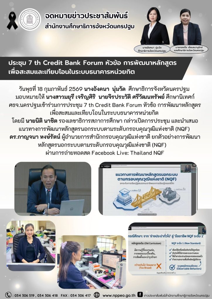 วันที่ 18 กุมภาพันธ์ 2569 นางอังคนา นุ่มวัด ศึกษาธิการจังหวัดนครปฐม มอบหมายให้ นางสาวมยุรี เจริญศิริ นายจิรประวัติ ศรีวัฒนทรัพย์ ศึกษานิเทศก์ ศธจ.นครปฐมเข้าร่วมการประชุม 7 th Credit Bank Forum หัวข้อ การพัฒนาหลักสูตรเพื่อสะสมและเทียบโอนในระบบธนาคารหน่วยกิต โดยมี นายนิติ นาชิต รองเลขาธิการสภาการศึกษา กล่าวเปิดการประชุม และนำเสนอแนวทางการพัฒนาหลักสูตรนอกระบบตามระดับกรอบคุณวุฒิแห่งชาติ (NQF) ดร.กาญจนา หงษ์รัตน์ ผู้อำนวยการสำนักกรอบคุณวุฒิแห่งชาติ ยกตัวอย่างการพัฒนาหลักสูตรนอกระบบตามระดับกรอบคุณวุฒิแห่งชาติ (NQF) ผ่านการถ่ายทอดสด Facebook Live: Thailand NQF
