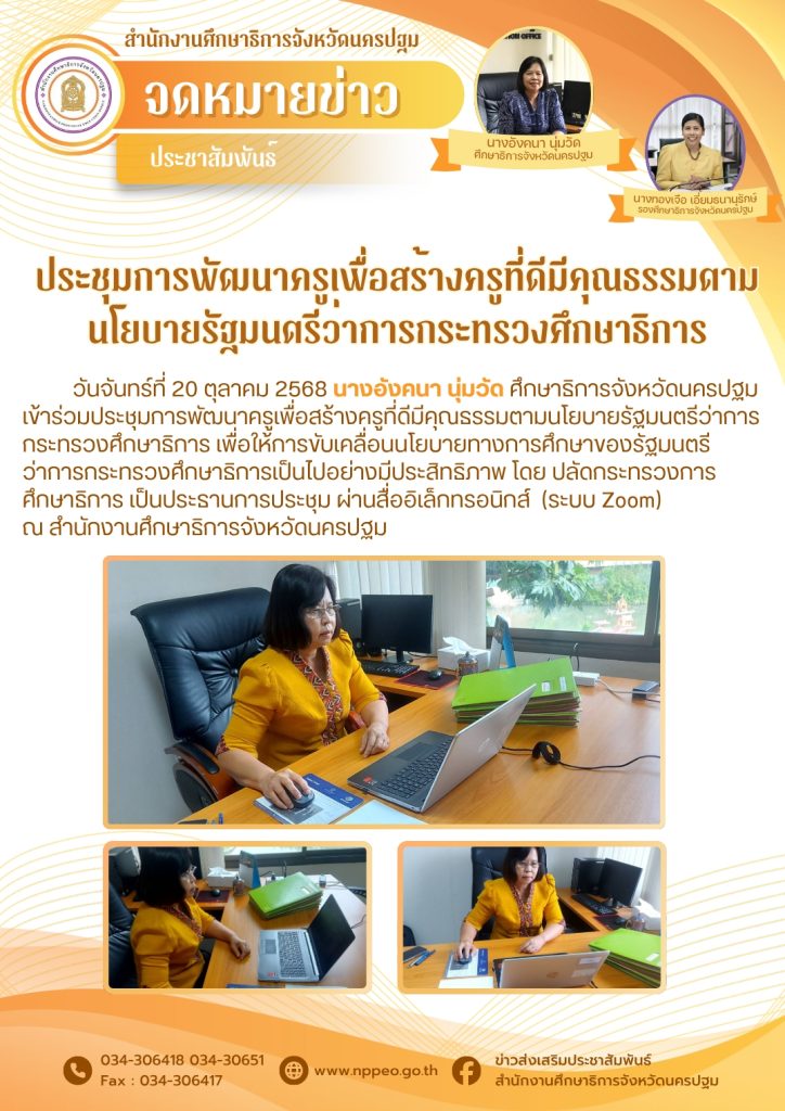 วันจันทร์ที่ 20 ตุลาคม 2568 นางอังคนา นุ่มวัด ศึกษาธิการจังหวัดนครปฐม เข้าร่วมประชุมการพัฒนาครูเพื่อสร้างครูที่ดีมีคุณธรรมตามนโยบายรัฐมนตรีว่าการกระทรวงศึกษาธิการ เพื่อให้การขับเคลื่อนนโยบายทางการศึกษาของรัฐมนตรีว่าการกระทรวงศึกษาธิการเป็นไปอย่างมีประสิทธิภาพ โดย ปลัดกระทรวงการศึกษาธิการ เป็นประธานการประชุม ผ่านสื่ออิเล็กทรอนิกส์ (ระบบ Zoom)ณ สำนักงานศึกษาธิการจังหวัดนครปฐม