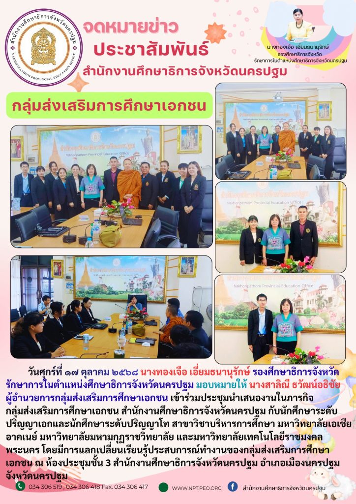วันศุกร์ที่ ๑๗ ตุลาคม ๒๕๖๘ นางทองเจือ เอี่ยมธนานุรักษ์ รองศึกษาธิการจังหวัด รักษาการในตำแหน่งศึกษาธิการจังหวัดนครปฐม มอบหมายให้ นางสาลิณี ธวัฒน์อธิชัยผู้อำนวยการกลุ่มส่งเสริมการศึกษาเอกชน เข้าร่วมประชุมนำเสนองานในภารกิจกลุ่มส่งเสริมการศึกษาเอกชน สำนักงานศึกษาธิการจังหวัดนครปฐม กับนักศึกษาระดับปริญญาเอกและนักศึกษาระดับปริญญาโท สาขาวิชาบริหารการศึกษา มหาวิทยาลัยเอเชียอาคเนย์ มหาวิทยาลัยมหามกุฏราชวิทยาลัย และมหาวิทยาลัยเทคโนโลยีราชมงคลพระนคร โดยมีการแลกเปลี่ยนเรียนรู้ประสบการณ์ทำงานของกลุ่มส่งเสริมการศึกษาเอกชน ณ ห้องประชุมชั้น 3 สำนักงานศึกษาธิการจังหวัดนครปฐม อำเภอเมืองนครปฐม จังหวัดนครปฐม