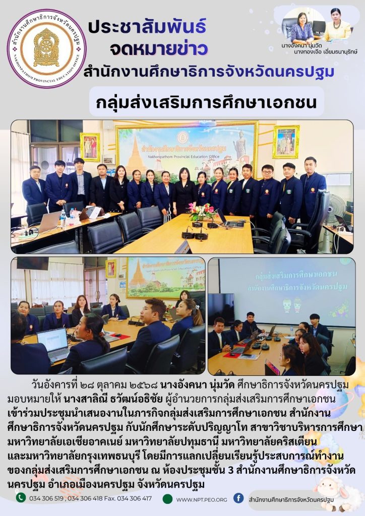วันอังคารที่ ๒๘ ตุลาคม ๒๕๖๘ นางอังคนา นุ่มวัด ศึกษาธิการจังหวัดนครปฐม มอบหมายให้ นางสาลิณี ธวัฒน์อธิชัย ผู้อำนวยการกลุ่มส่งเสริมการศึกษาเอกชน เข้าร่วมประชุมนำเสนองานในภารกิจกลุ่มส่งเสริมการศึกษาเอกชน สำนักงานศึกษาธิการจังหวัดนครปฐม กับนักศึกษาระดับปริญญาโท สาขาวิชาบริหารการศึกษา มหาวิทยาลัยเอเชียอาคเนย์ มหาวิทยาลัยปทุมธานี มหาวิทยาลัยคริสเตียน และมหาวิทยาลัยกรุงเทพธนบุรี โดยมีการแลกเปลี่ยนเรียนรู้ประสบการณ์ทำงาน ของกลุ่มส่งเสริมการศึกษาเอกชน ณ ห้องประชุมชั้น 3 สำนักงานศึกษาธิการจังหวัดนครปฐม อำเภอเมืองนครปฐม จังหวัดนครปฐม