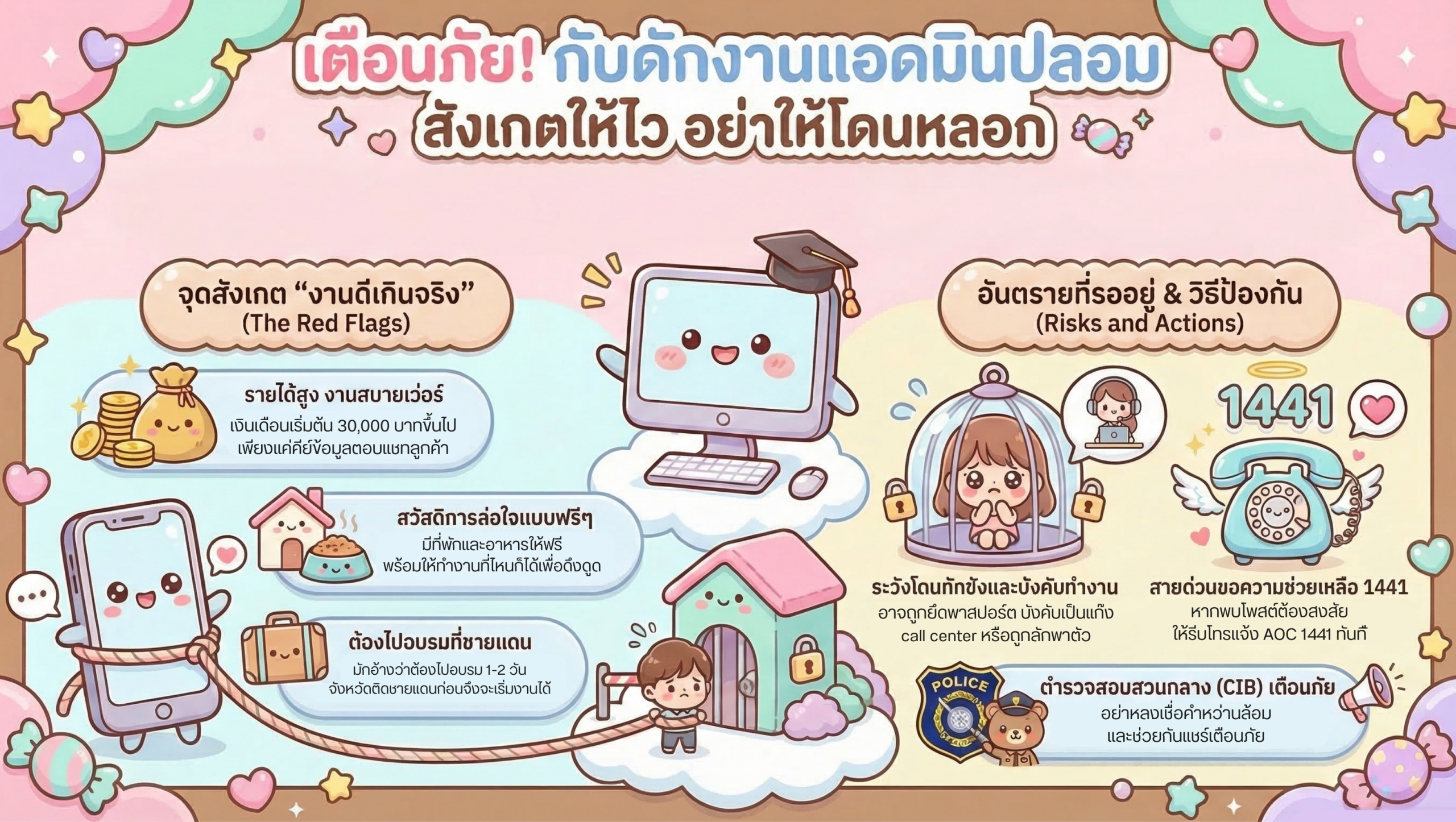 ประเด็นที่พบคือ การบังคับใช้แรงงานในธุรกิจผิดกฏหมาย (แก๊ง Call Center) การยึดหนังสือเดินทาง และการกักขังหน่วงเหนี่ยว ข้อมูลจากตำรวจสอบสวนกลาง (CIB) เน้นย้ำว่างานที่มีลักษณะ “รายได้สูงแต่ทักษะต่ำ” และต้องเดินทางไปอบรมในพื้นที่ติดชายแดน คือสัญญาณอันตรายของมิจฉาชีพ 100% ประชาชนควรเฝ้าระวังและแจ้งเหตุผ่านสายด่วน AOC 1441 ทันทีเมื่อพบเบาะแส