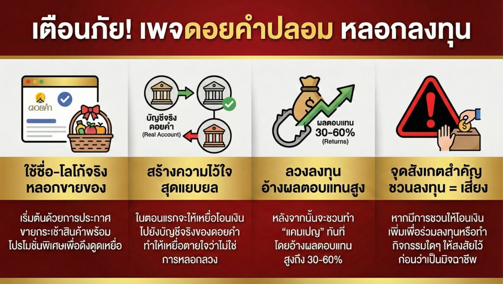 นี่คือมิติใหม่ของกลโกงออนไลน์ ที่ความจริงและความลวงถูกรวมเข้าด้วยกันอย่างแยกไม่ออก โดยใช้ความน่าเชื่อถือของแบรนด์เป็นเครื่องมือล่อลวงเหยื่อให้ตายใจ ก่อนจะลากเข้าไปสู่หลุมพรางที่เตรียมไว้ บทความนี้จะเปิดเผย 4 ขั้นตอนสุดแนบเนียนที่มิจฉาชีพใช้ชื่อ “ดอยคำ” มาสร้างเพจปลอม เพื่อเปลี่ยนความเชื่อมั่นของคุณให้กลายเป็นความสูญเสียในที่สุด