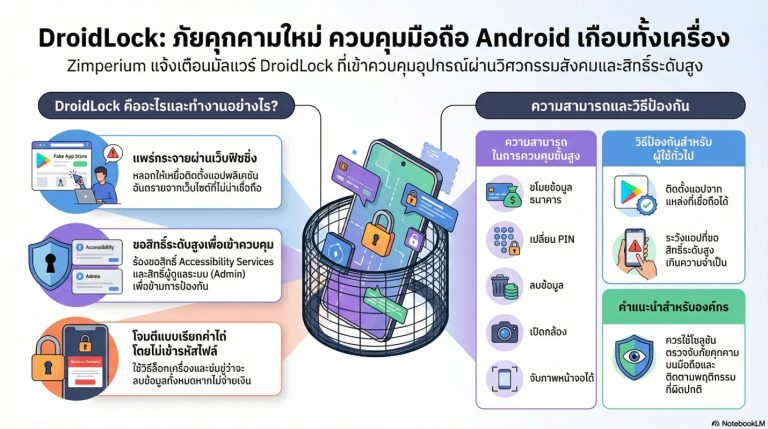ในยุคที่สมาร์ทโฟนเป็นส่วนหนึ่งของชีวิตประจำวัน เราต่างคุ้นเคยกับการใช้งานโทรศัพท์ Android เพื่อทำทุกอย่างตั้งแต่การสื่อสารไปจนถึงธุรกรรมทางการเงิน แต่ในขณะเดียวกัน ความกังวลเรื่องความปลอดภัยก็เพิ่มขึ้นเป็นเงาตามตัว ล่าสุดมีภัยคุกคามรูปแบบใหม่ที่ชื่อว่า “DroidLock” ปรากฎขึ้น ซึ่งสร้างความกังวลให้กับวงการความปลอดภัยทางไซเบอร์เป็นอย่างมาก