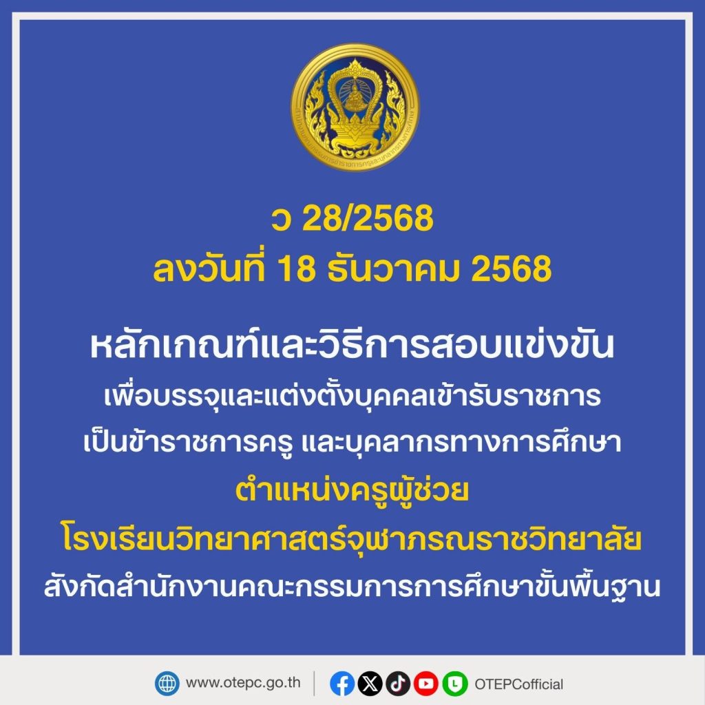 ว 28/2568 หลักเกณฑ์และวิธีการสอบแข่งขันเพื่อบรรจุและแต่งตั้งบุคคลเข้ารับราชการเป็นข้าราชการครู และบุคลากรทางการศึกษา ตำแหน่งครูผู้ช่วย โรงเรียนวิทยาศาสตร์จุฬาภรณราชวิทยาลัย สังกัดสำนักงานคณะกรรมการการศึกษาขั้นพื้นฐาน
