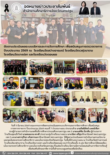 คณะกรรมการติดตามประเมินผลระบบบริหารและการจัดการศึกษา เพื่อสนับสนุน การตรวจราชการ ปีงบประมาณ 2569 คณะที่ 7 อำเภอบางเลน ประกอบด้วย นายกิตติพัทธ์ แพทย์เพียร รองผู้อำนวยการสำนักงานเขตพื้นที่การศึกษาประถมศึกษานครปฐม เขต 2 นายมนต์ชัย มั่นวศิน ผู้อำนวยการ โรงเรียนสุคนธีรวิทย์ นายสมหมาย ตรงดี ประธานกลุ่มโรงเรียนบางหลวง นางวนิดา ศรีสุข ศึกษานิเทศก์ สพป.นครปฐม เขต 2 และนางสาวจุรีพร แจ้งธรรมมา ศึกษานิเทศก์ ศธจ.นครปฐม ได้ติดตามประเมินผลการดำเนินงานตามนโยบาย และจุดเน้นของกระทรวงศึกษาธิการ และนโยบายของจังหวัดนครปฐม ในพื้นที่อำเภอบางเลน ณ โรงเรียนวัดสว่างอารมณ์ โรงเรียนวัดเวฬุวนาราม โรงเรียนวัดบางปลา และโรงเรียนวัดดอนยอ พบว่าโรงเรียนทั้ง 4 แห่ง จัดการศึกษาได้สอดคล้องนโยบายกระทรวงศึกษาธิการ และนโยบายจังหวัดนครปฐม ซึ่งแต่ละโรงเรียน มีความมีความโดดเด่นด้านการจัดการเรียนรู้เพื่อส่งเสริมทักษะอาชีพ รวมทั้งด้านระบบดูแลช่วยเหลือนักเรียน