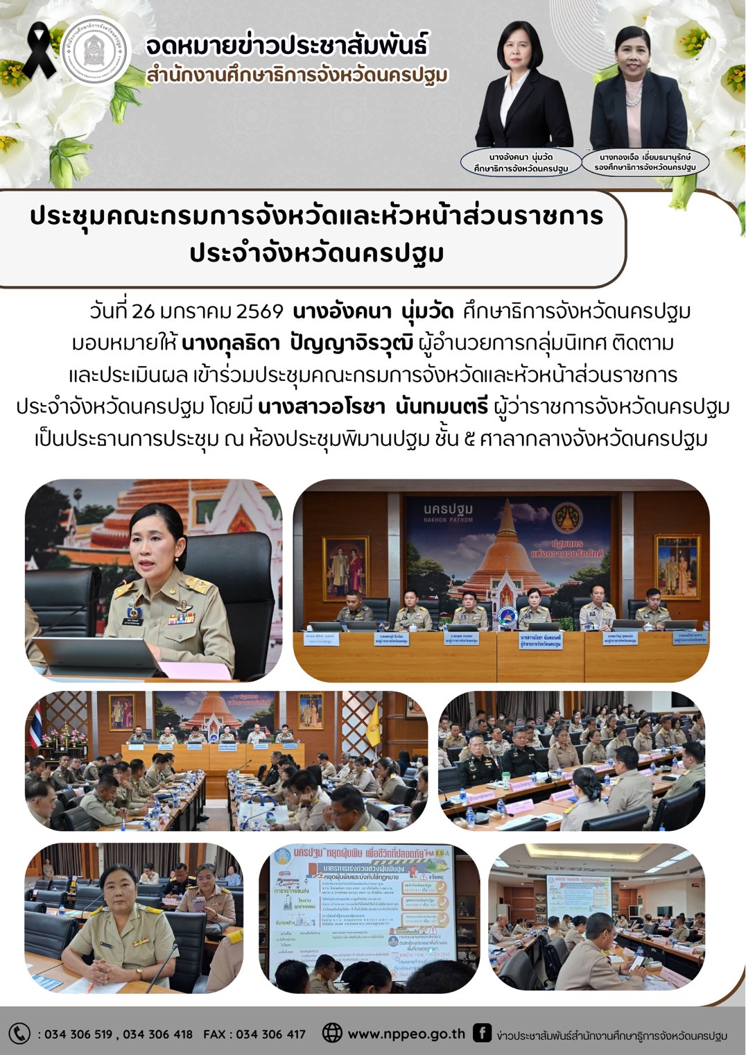 วันที่ 26 มกราคม 2569 นางอังคนา นุ่มวัด ศึกษาธิการจังหวัดนครปฐม มอบหมายให้นางกุลธิดา ปัญญาจิรวุฒิ ผู้อำนวยการกลุ่มนิเทศติดตามและประเมินผล เข้าร่วมประชุมคณะกรมการจังหวัดและหัวหน้าส่วนราชการประจำจังหวัดนครปฐม โดยมีนางสาวอโรชา นันทมนตรี ผู้ว่าราชการจังหวัดนครปฐม เป็นประธานการประชุม ณ ห้องประชุมพิมานปฐม ชั้น ๕ ศาลากลางจังหวัดนครปฐม
