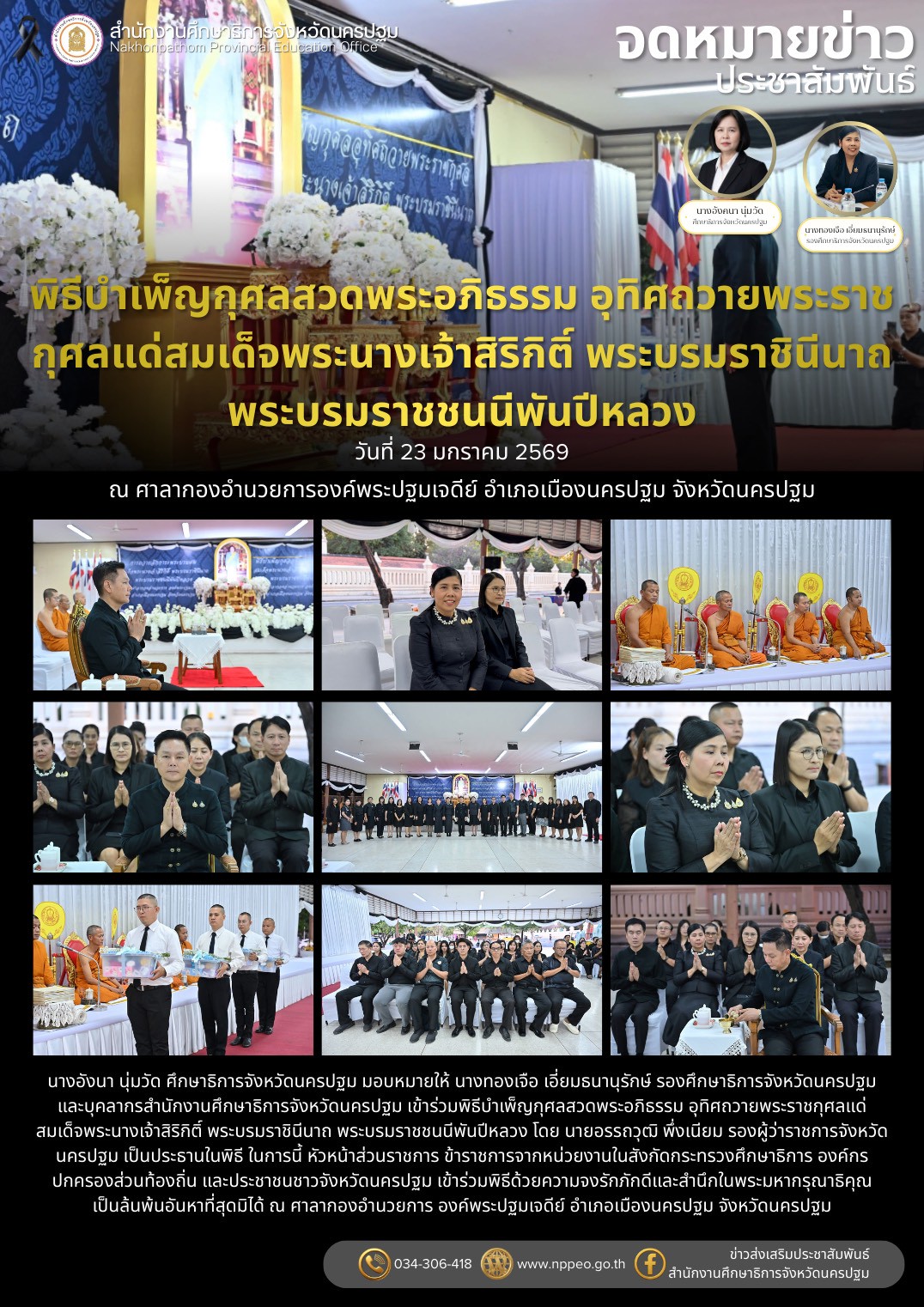 วันที่ 23 มกราคม 2569 นางอังนา นุ่มวัด ศึกษาธิการจังหวัดนครปฐม มอบหมายให้ นางทองเจือ เอี่ยมธนานุรักษ์ รองศึกษาธิการจังหวัดนครปฐม และบุคลากรสำนักงานศึกษาธิการจังหวัดนครปฐม เข้าร่วมพิธีบำเพ็ญกุศลสวดพระอภิธรรม อุทิศถวายพระราชกุศลแด่สมเด็จพระนางเจ้าสิริกิติ์ พระบรมราชินีนาถ พระบรมราชชนนีพันปีหลวง โดย นายอรรถวุฒิ พึ่งเนียม รองผู้ว่าราชการจังหวัดนครปฐม เป็นประธานในพิธี ในการนี้ หัวหน้าส่วนราชการ ข้าราชการจากหน่วยงานในสังกัดกระทรวงศึกษาธิการ องค์กรปกครองส่วนท้องถิ่น และประชาชนชาวจังหวัดนครปฐม เข้าร่วมพิธีด้วยความจงรักภักดีและสำนึกในพระมหากรุณาธิคุณเป็นล้นพ้นอันหาที่สุดมิได้ ณ ศาลากองอำนวยการ องค์พระปฐมเจดีย์ อำเภอเมืองนครปฐม จังหวัดนครปฐม