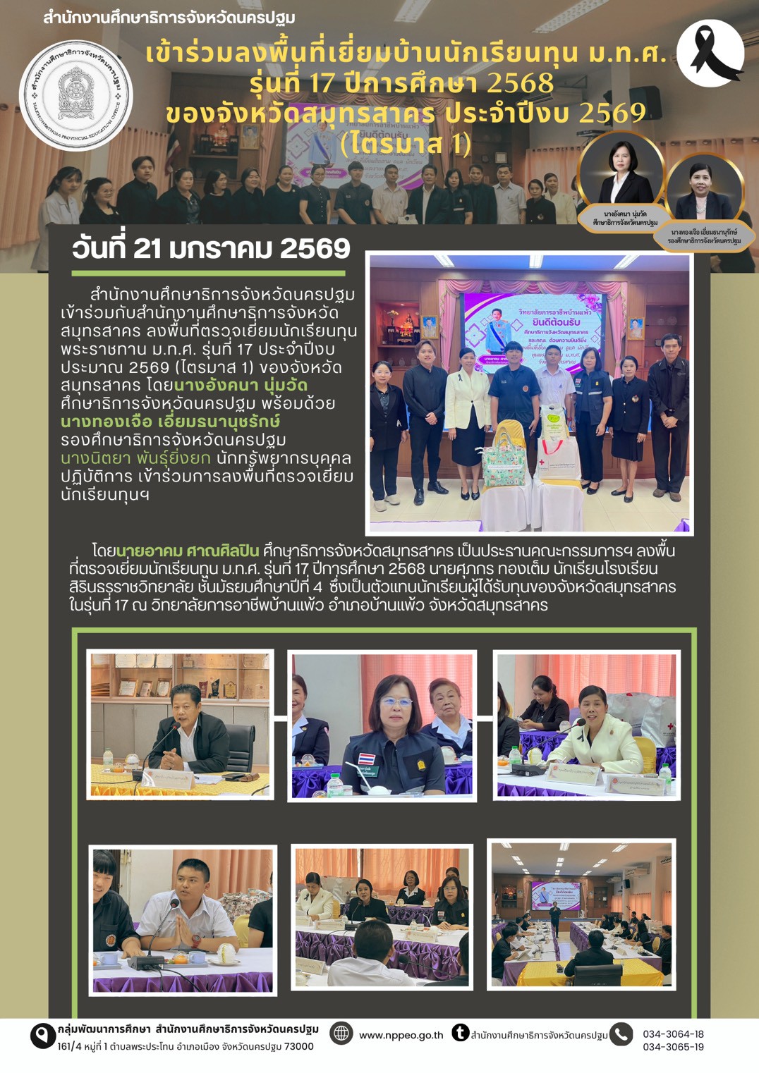 วันที่ 21 มกราคม 2569 สำนักงานศึกษาธิการจังหวัดนครปฐม เข้าร่วมกับสำนักงานศึกษาธิการจังหวัดสมุทรสาคร ลงพื้นที่ตรวจเยี่ยมนักเรียนทุนพระราชทาน ม.ท.ศ. รุ่นที่ 17 ประจำปีงบ ประมาณ 2569 (ไตรมาส 1) ของจังหวังสมุทรสาคร โดยนางอังคนา นุ่มวัด ศึกษาธิการจังหวัดนครปฐม พร้อมด้วยนางทองเจือ เอี่ยมธนานุชรักษ์ รองศึกษาธิการจังหวัดนครปฐม นางนิตยา พันธุ์ยิ่งยก นักทรัพยากรบุคคลปฏิบัติการ เข้าร่วมการลงพื้นที่ตรวจเยี่ยมนักเรียนทุนฯ