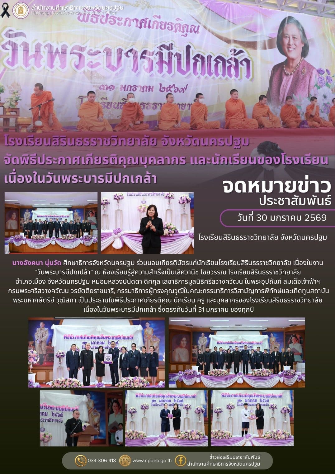 นางอังคนา นุ่มวัด ศึกษาธิการจังหวัดนครปฐม ร่วมมอบเกียรติบัตรแก่นักเรียนโรงเรียนสิรินธรราชวิทยาลัย เนื่องในงาน “วันพระบารมีปกเปล้า” ณ ห้องเรียนรู้สู่ความสำเร็จเป็นเลิศวานิช ไชยวรรณ โรงเรียนสิรินธรราชวิทยาลัย อำเภอเมือง จังหวัดนครปฐม หม่อมหลวงปนัดดา ดิศกุล เลขาธิการมูลนิธิศรีสวางควัฒน ในพระอุปถัมภ์ สมเด็จเจ้าฟ้าฯ กรมพระศรีสวางควัฒน วรขัตติยราชนารี, กรรมาธิการผู้ทรงคุณวุฒิในคณะกรรมาธิการวิสามัญการพิทักษ์และเทิดทูนสถาบันพระมหากษัตริย์ วุฒิสภา เป็นประธานในพิธีประกาศเกียรติคุณ นักเรียน ครู และบุคลากรของโรงเรียนสิรินธรราชวิทยาลัย เนื่องในวันพระบารมีปกเกล้า ซึ่งตรงกับวันที่ 31 มกราคม ของทุกปี