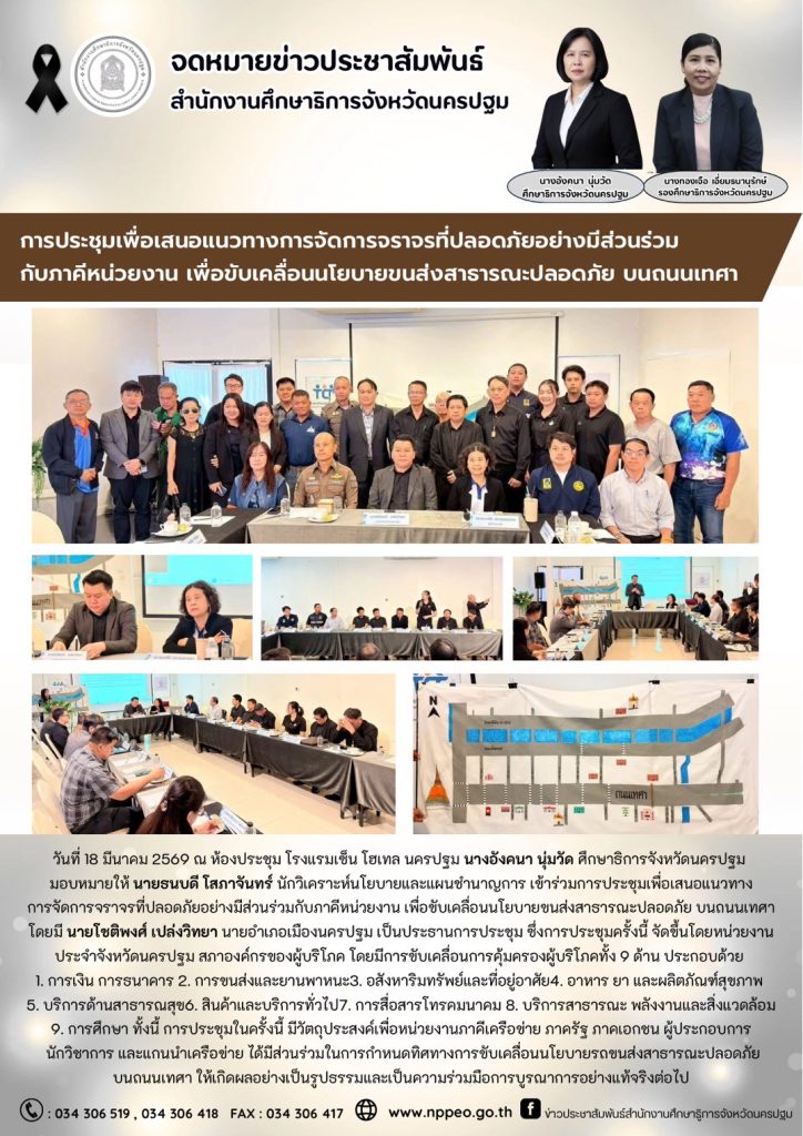 การจัดการจราจรที่ปลอดภัยอย่างมีส่วนร่วมกับภาคีหน่วยงาน เพื่อขับเคลื่อนนโยบายขนส่งสาธารณะปลอดภัย บนถนนเทศา โดยมี นายโชติพงศ์ เปล่งวิทยา นายอำเภอเมืองนครปฐม เป็นประธานการประชุม ซึ่งการประชุมครั้งนี้ จัดขึ้นโดยหน่วยงานประจำจังหวัดนครปฐม สภาองค์กรของผู้บริโภค โดยมีการขับเคลื่อนการคุ้มครองผู้บริโภคทั้ง 9 ด้าน ประกอบด้วย