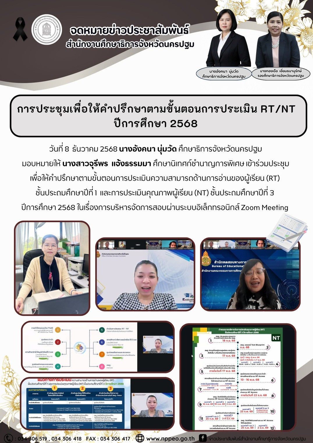 วันจันทร์ที่ 8 ธันวาคม 2568 นางอังคนา นุ่มวัด ศึกษาธิการจังหวัดนครปฐม มอบหมายให้ นางสาวจุรีพร แจ้งธรรมมา ศึกษานิเทศก์ชำนาญการพิเศษ เข้าร่วมประชุมเพื่อให้คำปรึกษาตามขั้นตอนการประเมินความสามารถด้านการอ่านของผู้เรียน (RT) ชั้นประถมศึกษาปีที่ 1 และการประเมินคุณภาพผู้เรียน (NT) ชั้นประถมศึกษาปีที่ 3 ปีการศึกษา 2568 ในเรื่องการบริหารจัดการสอบผ่านระบบอิเล็กทรอนิกส์ Zoom Meeting