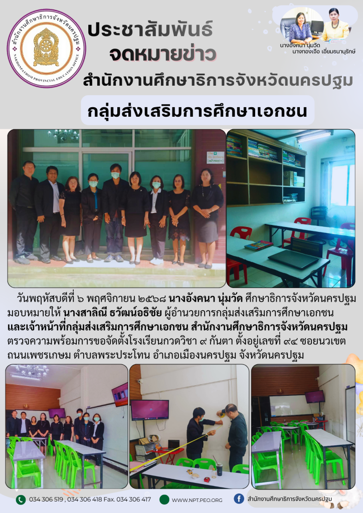 วันพฤหัสบดีที่ 6 พฤศจิกายน 2568 นางอังคนา นุ่มวัด ศึกษาธิการจังหวัดนครปฐม มอบหมายให้ นางสาลิณี ธวัฒน์อธิชัย ผู้อำนวยการกลุ่มส่งเสริมเอกชน และเจ้าหน้าที่กลุ่มส่งเสริมการศึกษาเอกชน สำนักงานศึกษาธิการจังหวัดนครปฐม ตรวจความพร้อมการขอจัดตั้งโรงเรียนกวดวิชา 9 กันตา ตั้งอยู่ที่เลขที่ 94 ซอยนวเขต ถนนเพชรเกษม ตำบลพระประโทน อำเภอเมืองนครปฐม จังหวัดนครปฐม