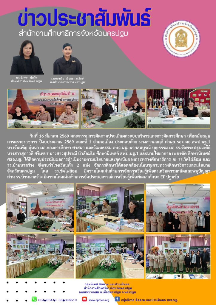 คณะกรรมการติดตามประเมินผลระบบบริหารและการจัดการศึกษา เพื่อสนับสนุนการตรวจราชการ ปีงบประมาณ 2569 คณะที่ 1 อำเภอเมือง ประกอบด้วย นางสาวมลฤดี คำผุย รอง ผอ.สพป.นฐ.1 นางวันเพ้ญ อุ่นนา ผอ.กองการศึกษา ศาสนา และวัฒนธรรม อบจ.นฐ. นายสมบูรณ์ บุญธรรม ผอ.รร.วัดพระปฐมเจดีย์ นางสาวสุภาวดี ศรีเพชร นางสาวสุปราณี บัวล้อมใบ ศึกษานิเทศก์ สพป.นฐ.1 และนายไชยากาล เพชรชัด ศึกษานิเทศก์ ศธจ.นฐ. ได้ติดตามประเมินผลการดำเนินงานตามนโยบายและจุดเน้นของกระทรวงศึกษาธิการ ณ รร.วัดไผ่ล้อม และ รร.บ้านนาสร้าง ซึ่งพบว่าโรงเรียนทั้ง 2 แห่ง จัดการศึกษาได้สอดคล้องนโยบายกระทรวงศึกษาธิการและนโยบายจังหวัดนครปฐม โดย รร.วัดไผ่ล้อม มีความโดดเด่นด้านการจัดการเรียนรู้เพื่อส่งเสริมความถนัดและพหุปัญญา ส่วน รร.บ้านนาสร้าง มีความโดดเด่นด้านการจัดประสบการณ์การเรียนรู้เพื่อพัฒนาทักษะ EF ปฐมวัย