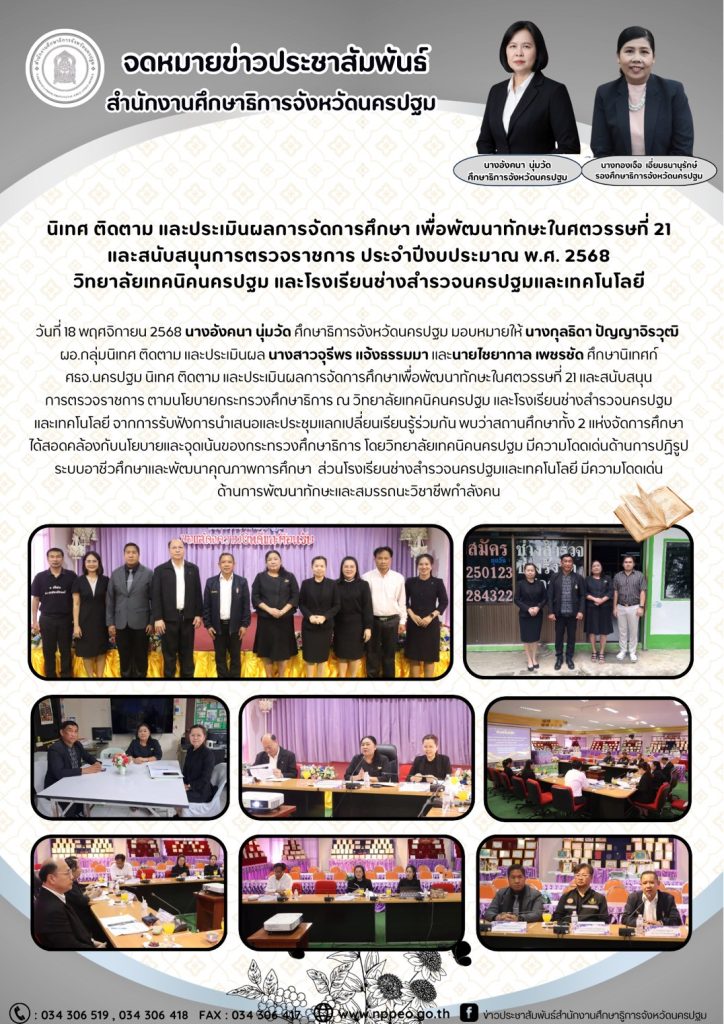 วันอังคารที่ 18 พฤศจิกายน 2568 นางอังคนา นุ่มวัด ศึกษาธิการจังหวัดนครปฐม มอบหมายให้ นางกุลธิดา ปัญญาจิรวุฒิ ผอ.กลุ่มนิเทศ ติดตาม และประเมินผล นางสาวจุรีพร แจ้งธรรมมา และนายไชยากาล เพชรชัด ศึกษานิเทศก์ ศธจ.นครปฐม นิเทศ ติดตาม และประเมินผลการจัดการศึกษาเพื่อพัฒนาทักษะในศตวรรษที่ 21 และสนับสนุน การตรวจราชการ ตามนโยบายกระทรวงศึกษาธิการ ณ วิทยาลัยเทคนิคนครปฐม และโรงเรียนช่างสำรวจนครปฐม และเทคโนโลยี จากการรับฟังการนำเสนอและประชุมแลกเปลี่ยนเรียนรู้ร่วมกัน พบว่าสถานศึกษาทั้ง 2 แห่งจัดการศึกษาได้สอดคล้องกับนโยบายและจุดเน้นของกระทรวงศึกษาธิการ โดยวิทยาลัยเทคนิคนครปฐม มีความโดดเด่นด้านการปฏิรูประบบอาชีวศึกษาและพัฒนาคุณภาพการศึกษา ส่วนโรงเรียนช่างสำรวจนครปฐมและเทคโนโลยี มีความโดดเด่น ด้านการพัฒนาทักษะและสมรรถนะวิชาชีพกำลังคน