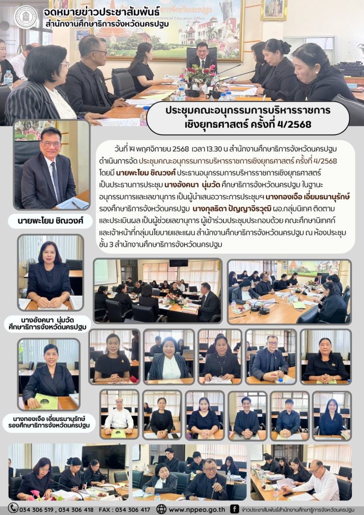 วันศุกร์ที่ 14 พฤศจิกายน 2568 สำนักงานศึกษาธิการจังหวัดนครปฐม ดำเนินการจัด ประชุมคณะอนุกรรมการบริหารราชการเชิงยุทธศาสตร์ ครั้งที่ 4/2568 โดยมี นายพะโยม ชิณวงศ์ ประธานอนุกรรมการบริหารราชการเชิงยุทธศาสตร์ เป็นประธานการประชุม นางอังคนา นุ่มวัด ศึกษาธิการจังหวัดนครปฐม ในฐานะอนุกรรมการและเลขานุการ เป็นผู้เสนอวาระการประชุมฯ นางทองเจือ เอี่ยมธนานุรักษ์ รองศึกษาธิการจังหวัดนครปฐม นางกุลธิดา ปัญญาจิรวุฒิ ผอ.กลุ่มนิเทศ ติดตาม และประเมินผล เป็นผู้ช่วยเลขานุการ ผู้เข้าร่วมประชุมประกอบด้วย คณะศึกษานิเทศก์ และเจ้าหน้าที่กลุ่มนโยบายและแผน สำนักงานศึกษาธิการจังหวัดนครปฐม ณ ห้องประชุมชั้น 3 สำนักงานศึกษาธิการจังหวัดนครปฐม