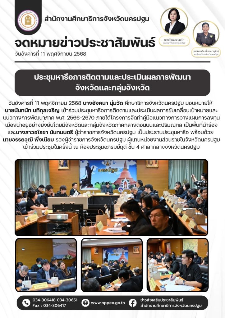 วันอังคารที่ 11 พฤศจิกายน 2568 นางอังคนา นุ่มวัด ศึกษาธิการจังหวัดนครปฐม มอบหมายใหั นายนันทนัท นทีกุลเจริญ เข้าร่วมประชุมหารือการติดตามและประเมินผลการขับเคลื่อนเป้าหมายและแนวทางการพัฒนาภาค พ.ศ. 2566-2670 ภายใต้โครงการจัดทำคู่มือแนวทางการวางแผนการลงทุนเมืองน่าอยู่อย่างยั่งยืนโดยมีจังหวัดและกลุ่มจังหวัดภาคกลางตอนบนและปริมณฑล เป็นพื้นที่นำร่อง และนางสาวอโรชา นันทมนตรี ผู้ว่าราชการจังหวัดนครปฐม เป็นประธานประชุมหารือ พร้อมด้วย นายอรรถวุฒิ พึ่งเนียม รองผู้ว่าราชการจังหวัดนครปฐม ผู้แทนหน่วยงานส่วนราชในจังหวัดนครปฐมเข้าร่วมประชุมในครั้งนี้ ณ ห้องประชุมอภิรมย์ฤดี ชั้น 4 ศาลากลางจังหวัดนครปฐม