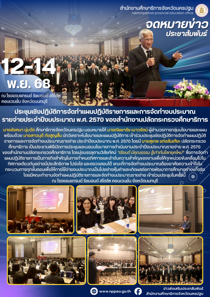 นางอังคนา นุ่มวัด ศึกษาธิการจังหวัดนครปฐม มอบหมายให้ นางณิชชารัช เนาวรัตน์ ผู้อำนวยการกลุ่มนโยบายและแผน พร้อมด้วย นางสาวนุดี ภัยสูญสิ้น นักวิเคราะห์นโยบายและแผนปฏิบัติการ เข้าร่วมประชุมเชิงปฏิบัติการจัดทำแผนปฏิบัติราชการและการจัดทำงบประมาณรายจ่าย ประจำปีงบประมาณ พ.ศ. 2570 โดยมี นายสุเทพ แก่งสันเทียะ ปลัดกระทรวงศึกษาธิการ เป็นประธานพิธีเปิดการประชุมและมอบนโยบายการดำเนินงานประจำปีงบประมาณรายจ่าย พ.ศ. 2570 ของสำนักงานปลัดกระทรวงศึกษาธิการ โดยมุ่งบรรลุตามวิสัยทัศน์ “เรียนดี มีคุณธรรม รู้เท่าทันโลกยุคใหม่” ซึ่งการจัดทำแผนปฏิบัติราชการเป็นภารกิจสำคัญในการกำหนดทิศทางและลำดับความสำคัญของงานเพื่อให้ทุกหน่วยขับเคลื่อนไปในทิศทางเดียวกันอย่างมีประสิทธิภาพ โปร่งใส และตรวจสอบได้ ขณะที่การจัดทำงบประมาณต้องอาศัยความเข้าใจในกระบวนการทุกขั้นตอนเพื่อให้การใช้จ่ายงบประมาณเป็นไปอย่างคุ้มค่าและเกิดผลต่อการพัฒนาการศึกษาอย่างแท้่จริง โดยมีคณะทำงานจัดทำแผนปฏิบัติราชการและจัดทำงบประมาณรายจ่าย เข้าร่วมประชุมในครั้งนี้ ณ โรงแรมแกรนด์ ริชมอนด์ สไตลิซ คอนเวนชั่น จังหวัดนนทบุรี