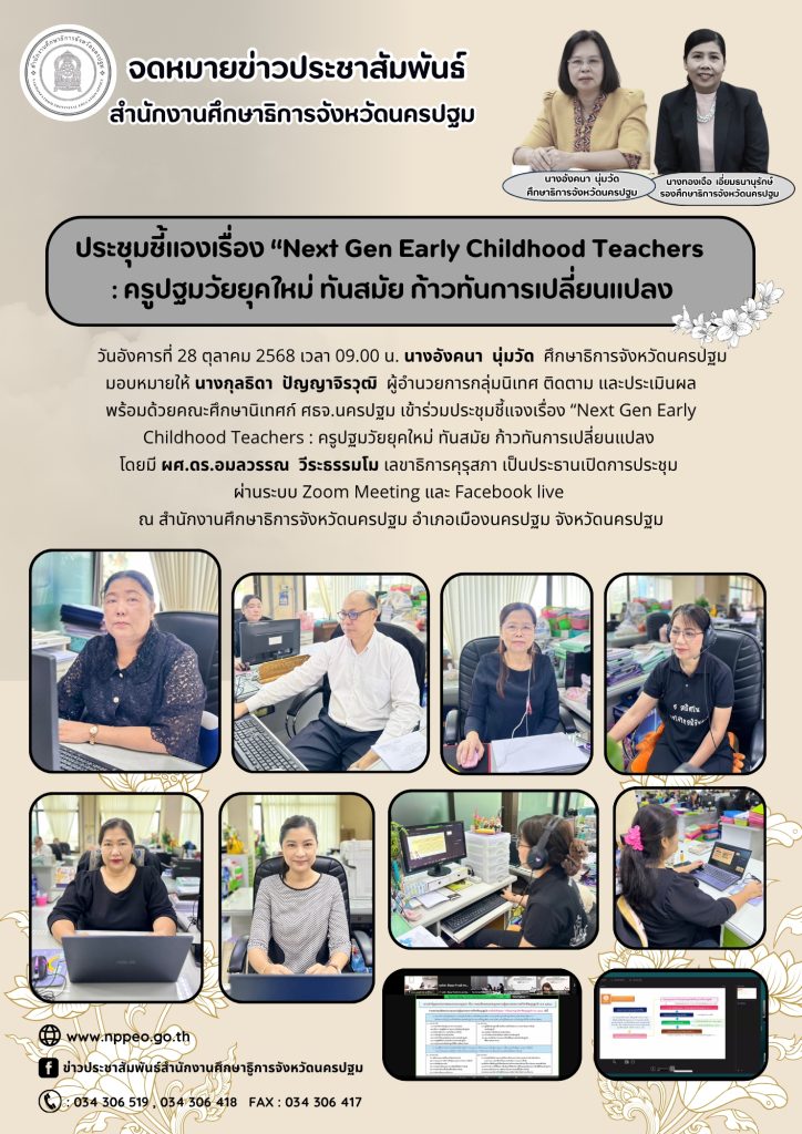 วันอังคารที่ 28 ตุลาคม 2568 เวลา 09.00 น. นางอังคนา นุ่มวัด ศึกษาธิการจังหวัดนครปฐม มอบหมายให้ นางกุลธิดา ปัญญาจิรวุฒิ ผู้อำนวยการกลุ่มนิเทศ ติดตาม และประเมินผล พร้อมด้วยคณะศึกษานิเทศก์ ศธจ.นครปฐม เข้าร่วมประชุมชี้แจงเรื่อง “Next Gen Early Childhood Teachers : ครูปฐมวัยยุคใหม่ ทันสมัย ก้าวทันการเปลี่ยนแปลง โดยมี ผศ.ดร.อมลวรรณ วีระธรรมโม เลขาธิการคุรุสภา เป็นประธานเปิดการประชุม ผ่านระบบ Zoom Meeting และ Facebook live ณ สำนักงานศึกษาธิการจังหวัดนครปฐม อำเภอเมืองนครปฐม จังหวัดนครปฐม