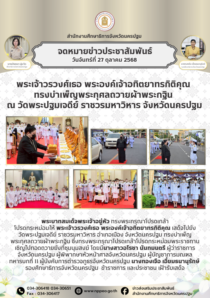 วันที่ 27 ตุลาคม 2568 พระบาทสมเด็จพระเจ้าอยู่หัว ทรงพระกรุณาโปรดเกล้าโปรดกระหม่อมให้ พระเจ้าวรวงศ์เธอ พระองค์เจ้าอทิตยาทรกิติคุณ เสด็จไปยังวัดพระปฐมเจดีย์ ราชวรมหาวิหาร อำเภอเมือง จังหวัดนครปฐม ทรงบำเพ็ญพระกุศลถวายผ้าพระกฐิน ซึ่งทรงพระกรุณาโปรดเกล้าโปรดกระหม่อมพระราชทานเชิญไปทอดถวายยังที่ชุมนุมสงฆ์ โดยมีนางสาวอโรชา นันทมนตรี ผู้ว่าราชการจังหวัดนครปฐม ผู้พิพากษาหัวหน้าศาลจังหวัดนครปฐม ผู้บัญชาการมณฑลทหารบกที่ 11 ผู้บังคับการตำรวจภูธรจังหวัดนครปฐม นางทองเจือ เอี่ยมธนานุรักษ์ รองศึกษาธิการจังหวัดนครปฐม ข้าราชการ และประชาชน เฝ้ารับเสด็จ