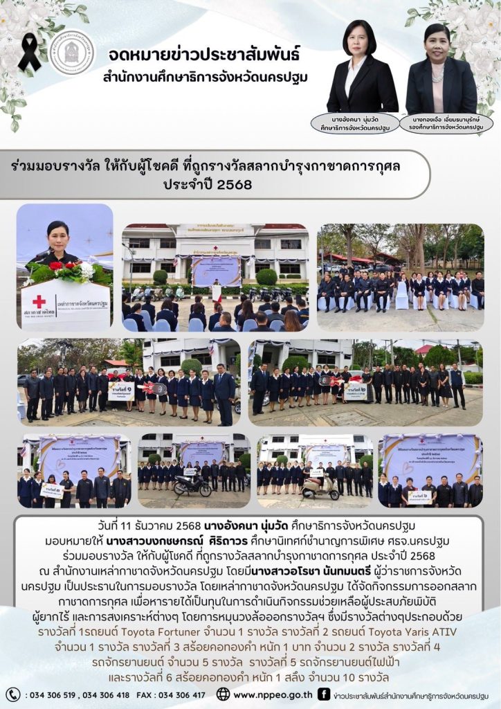 มอบหมายให้ นางสาวบงกชษกรณ์ ศิริถาวร ศึกษานิเทศก์ชำนาญการพิเศษ ศธจ.นครปฐม ร่วมมอบรางวัล ให้กับผู้โชคดี ที่ถูกรางวัลสลากบำรุงกาชาดการกุศล ประจำปี 2568 ณ สำนักงานเหล่ากาชาดจังหวัดนครปฐม โดยมีนางสาวอโรชา นันทมนตรี ผู้ว่าราชการจังหวัดนครปฐม เป็นประธานในการมอบรางวัล โดยเหล่ากาชาดจังหวัดนครปฐม ได้จัดกิจกรรมการออกสลากกาชาดการกุศล เพื่อหารายได้เป็นทุนในการดำเนินกิจกรรมช่วยเหลือผู้ประสบภัยพิบัติ