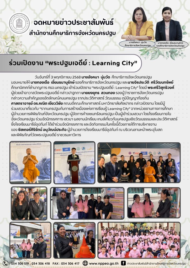วันจันทร์ที่ 3 พฤศจิกายน 2568 นางอังคนา นุ่มวัด ศึกษาธิการจังหวัดนครปฐม มอบหมายให้ นางทองเจือ เอี่ยมธนานุรักษ์ รองศึกษาธิการจังหวัดนครปฐม และนายจิรประวัติ ศรีวัฒนทรัพย์ ศึกษานิเทศก์ชำนาญการ ศธจ.นครปฐม เข้าร่วมเปิดงาน “พระปฐมเจดีย์ : Learning City” โดยมี พระศรีวิสุทธิวงศ์ ผู้ช่วยเจ้าอาวาสวัดพระปฐมเจดีย์ กล่าวปาฐกถา นายยงยุทธ สวนทอง รองผู้ว่าราชการจังหวัดนครปฐม กล่าวความสำคัญของอัตลักษณ์คนนครปฐม รากประวัติศาสตร์ วัฒนธรรม ภูมิปัญญาท้องถิ่น ศาสตราจารย์ ดร.คณิต เขียววิชัย คณบดีคณะศึกษาศาสตร์ มหาวิทยาลัยศิลปากร กล่าวเปิดงาน โดยมีผู้ร่วมเสวนาเกี่ยวกับ “รากนครปฐมกับการสร้างเมืองแห่งการเรียนรู้ Learning City” จากหน่วยงานทางการศึกษา ผู้อำนวยการพิพิธภัณฑ์จังหวัดนครปฐม ผู้จัดการห้างเซนทรัลนครปฐม เป็นผู้เข้าร่วมเสวนา โดยโรงเรียนภายในจังหวัดนครปฐม ร่วมจัดนิทรรศการ เสวนา ผลงานนักเรียน เกมส์เกี่ยวกับนครปฐมเชิงวัฒนธรรมและประวัติศาสตร์ ซึ่งโรงเรียนมารีย์อุปถัมภ์ ได้เข้าร่วมจัดนิทรรศการ และจัดกิจกรรมในครั้งนี้ด้วยภายใต้การบริหารงานของ ซิสเตอร์ศิริรัตน์ อนุวัฒน์ประกิจ ผู้อำนวยการโรงเรียนมารีย์อุปถัมภ์ ณ บริเวณลานหน้าพระอุโบสถ และพิพิธภัณฑ์วัดพระปฐมเจดีย์ ราชวรมหาวิหาร