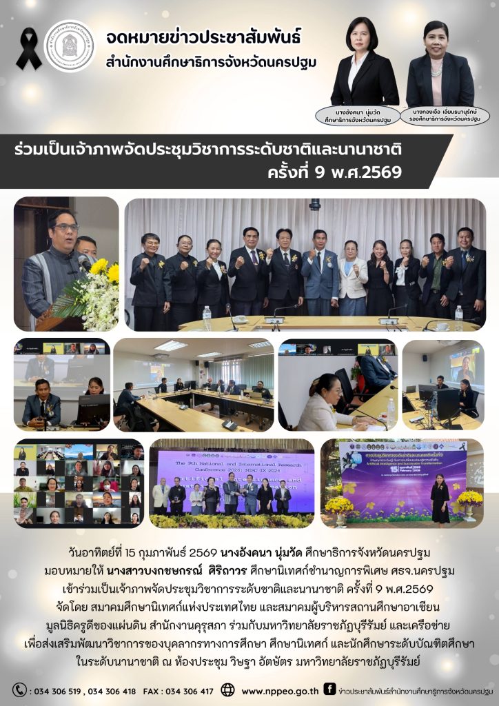 วันที่ 15 กุมภาพันธ์ 2569 นางอังคนา นุ่มวัด ศึกษาธิการจังหวัดนครปฐม มอบหมายให้ นางสาวบงกชษกรณ์ ศิริถาวร ศึกษานิเทศก์ชำนาญการพิเศษ ศธจ.นครปฐม เข้าร่วมเป็นเจ้าภาพจัดประชุมวิชาการระดับชาติและนานาชาติ ครั้งที่ 9 พ.ศ.2569 จัดโดย สมาคมศึกษานิเทศก์แห่งประเทศไทย และสมาคมผู้บริหารสถานศึกษาอาเซียน มูลนิธิครูดีของแผ่นดิน สำนักงานคุรุสภา ร่วมกับมหาวิทยาลัยราชภัฏบุรีรัมย์ และเครือข่าย เพื่อส่งเสริมพัฒนาวิชาการของบุคลากรทางการศึกษา ศึกษานิเทศก์ และนักศึกษาระดับบัณฑิตศึกษา ในระดับนานาชาติ ณ ห้องประชุม วิษฐา อัตษัตร มหาวิทยาลัยราชภัฏบุรีรัมย์