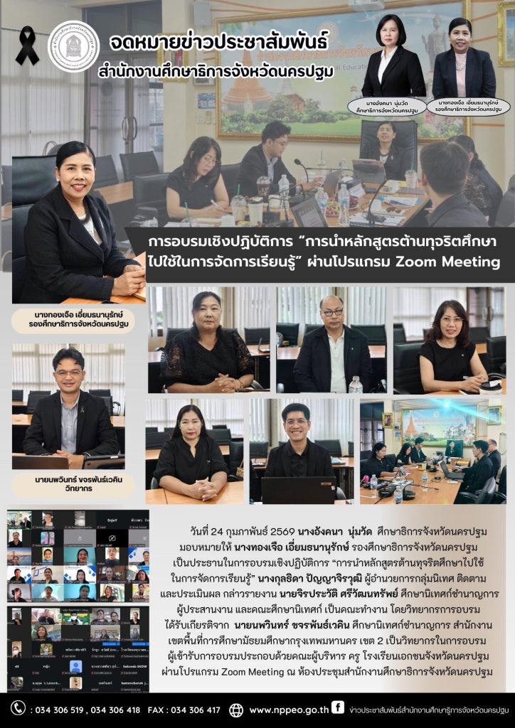 นางอังคนา นุ่มวัด ศึกษาธิการจังหวัดนครปฐม มอบหมายให้ นางทองเจือ เอี่ยมธนานุรักษ์ รองศึกษาธิการจังหวัดนครปฐม เป็นประธานในการอบรมเชิงปฏิบัติการ “การนำหลักสูตรต้านทุจริตศึกษาไปใช้ ในการจัดการเรียนรู้” นางกุลธิดา ปัญญาจิรวุฒิ ผู้อำนวยการกลุ่มนิเทศ ติดตาม และประเมินผล กล่าวรายงาน นายจิรประวัติ ศรีวัฒนทรัพย์ ศึกษานิเทศก์ชำนาญการ ผู้ประสานงาน และคณะศึกษานิเทศก์ เป็นคณะทำงาน โดยวิทยากรการอบรม ได้รับเกียรติจาก นายนพวินทร์ ขจรพันธ์เวคิน ศึกษานิเทศก์ชำนาญการ สำนักงาน เขตพื้นที่การศึกษามัธยมศึกษากรุงเทพมหานคร เขต 2 เป็นวิทยากรในการอบรม ผู้เข้ารับการอบรมประกอบด้วยคณะผู้บริหาร ครู โรงเรียนเอกชนจังหวัดนครปฐม ผ่านโปรแกรม Zoom Meeting ณ ห้องประชุมสำนักงานศึกษาธิการจังหวัดนครปฐม