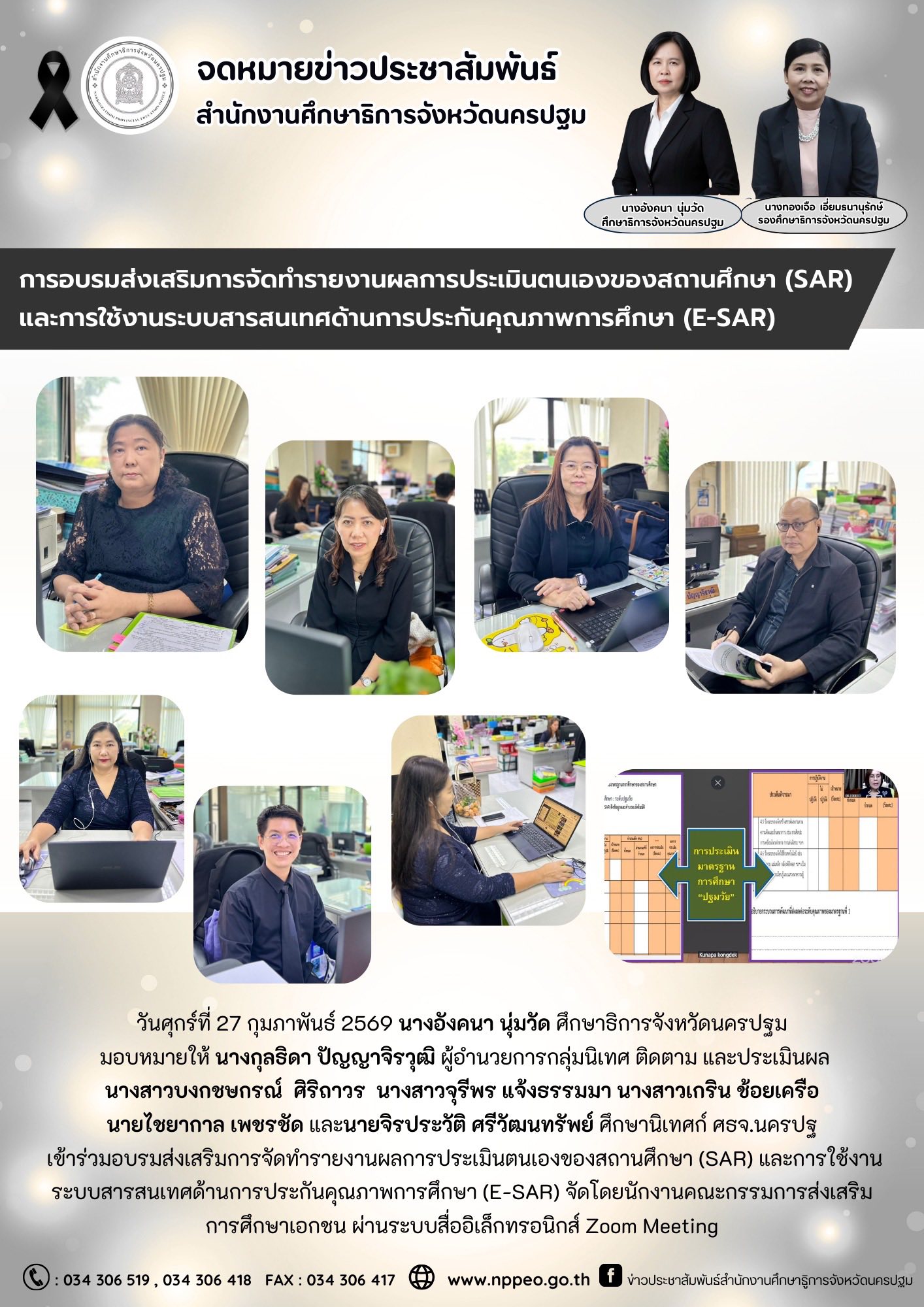 วันที่ 27 กุมภาพันธ์ 2569 นางอังคนา นุ่มวัด ศึกษาธิการจังหวัดนครปฐม มอบหมายให้ นางกุลธิดา ปัญญาจิรวุฒิ ผู้อำนวยการกลุ่มนิเทศ ติดตาม และประเมินผล นางสาวบงกชษกรณ์ ศิริถาวร นางสาวจุรีพร แจ้งธรรมมา นางสาวเกริน ช้อยเครือ นายไชยากาล เพชรชัด และนายจิรประวัติ ศรีวัฒนทรัพย์ ศึกษานิเทศก์ ศธจ.นครปฐม เข้าร่วมอบรมส่งเสริมการจัดทํารายงานผลการประเมินตนเองของสถานศึกษา (SAR) และการใช้งานระบบสารสนเทศด้านการประกันคุณภาพการศึกษา (E-SAR) จัดโดยนักงานคณะกรรมการส่งเสริม การศึกษาเอกชน ผ่านระบบสื่ออิเล็กทรอนิกส์ Zoom Meeting