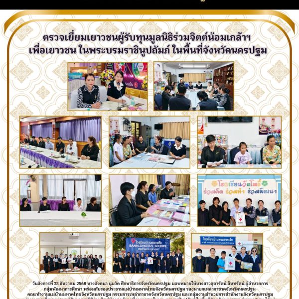วันที่ 23 ธันวาคม 2568 นางอังคนา นุ่มวัด ศึกษาธิการจังหวัดนครปฐม มอบหมายให้นางสาวสุดารัตน์ อินทรัตน์ ผู้อำนวยการกลุ่มพัฒนาการศึกษา พร้อมกับรองประธานแม่บ้านมหาดไทยจังหวัดนครปฐม รองนายกเหล่ากาชาดจังหวัดนครปฐม คณะทำงานแม่บ้านมหาดไทยจังหวัดนครปฐม กรรมการเหล่ากาชาดจังหวัดนครปฐม และกลุ่มงานอำนวยการสำนักงานจังหวัดนครปฐม ร่วมตรวจเยี่ยมเยาวชนผู้รับทุนมูลนิธิร่วมจิตต์น้อมเกล้าฯ เพื่อเยาวชน ในพระบรมราชินูปถัมภ์ ในพื้นที่จังหวัดนครปฐม จำนวน 7 คน ได้แก่ 1)เด็กชายกรวิชญ์ สระหงษ์ทอง ระดับชั้น ป.5 โรงเรียนบ้านหนองพงเล็ก 2)เด็กหญิงณัฐฐาพนิตตา แซ่ตั๊น ระดับชั้น ป.6 โรงเรียนบ้านคลองตัน 3)เด็กชายธรรมสิริ กวินธนเจริญ ระดับชั้น ม.2 โรงเรียนวัดโพธิ์ 4)เด็กหญิงชลนิชา ห้วยหงษ์ทอง ระดับ ม.3 โรงเรียนคงทองวิทยา 5)เด็กชายธนวินท์ สามงามนุ ระดับชั้น ม.3 โรงเรียนคงทองวิทยา 6)เด็กหญิงธิดาดิน สระทองแมว ระดับชั้น ป.3 โรงเรียนวัดแหลมมะเกลือ 7)เด็กชายศิริโชค พิสินนาวงษ์ ระดับชั้น ม.3 โรงเรียนศรีวิชัยวิทยา