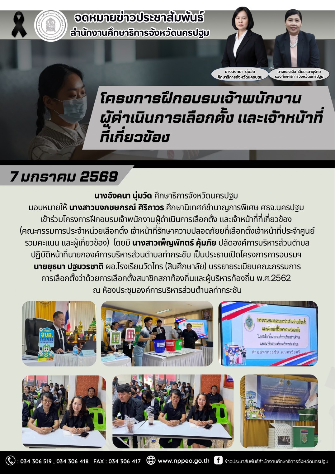 วันที่ 7 มกราคม 2569 นางอังคนา นุ่มวัด ศึกษาธิการจังหวัดนครปฐม มอบหมายให้ นางสาวบงกชษกรณ์ ศิริถาวร ศึกษานิเทศก์ชำนาญการพิเศษ ศธจ.นครปฐม เข้าร่วมโครงการฝึกอบรมเจ้าพนักงานผู้ดำเนินการเลือกตั้ง และเจ้าหน้าที่ที่เกี่ยวข้อง (คณะกรรมการประจำหน่วยเลือกตั้ง เจ้าหน้าที่รักษาความปลอดภัยยที่เลือกตั้งเจ้าหน้าที่ประจำศูนย์รวมคะแนน และผู้เกี่ยวข้อง) โดยมี นางสาวเพ็ญพักตร์ คุ้มภัย ปลัดองค์การบริหารส่วนตำบลปฏิบัติหน้าที่นายกองค์การบริหารส่วนตำบลท่ากระชับ เป็นประธานเปิดโครงการการอบรมฯ นายยุธนา ปฐมวรชาติ ผอ.โรงเรียนวัดไทร (สินศึกษาลัย) บรรยายระเบียบคณะกรรมการ การเลือกตั้งว่าด้วยการเลือกตั้งสมาชิกสภาท้องถิ่นและผู้บริหารท้องถิ่น พ.ศ.2562 ณ ห้องประชุมองค์การบริหารส่วนตำบลท่ากระชับ